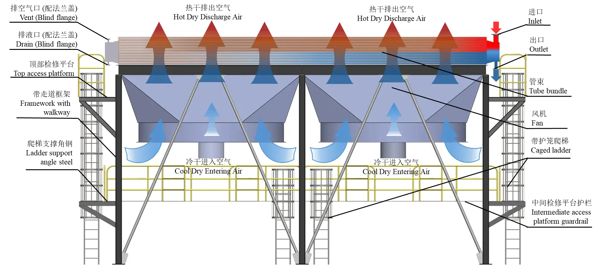 Dry air coolers comprise finned tube bundles, fans, louvers, maintenance platforms, frames, and other user-specified components. During operation, the medium to be cooled flows through the tubes while the fan drives ambient air over the external fins. Utilising the temperature differential between the tube interior and exterior, coupled with the enhanced heat transfer surface provided by the fins, the system achieves condensation and cooling of the internal medium. This process conserves 100% of water resources. Employing ambient air as the cooling medium, this equipment finds extensive application across chemical processing, petrochemicals, refining, power generation, waste-to-energy plants, and steelworks.