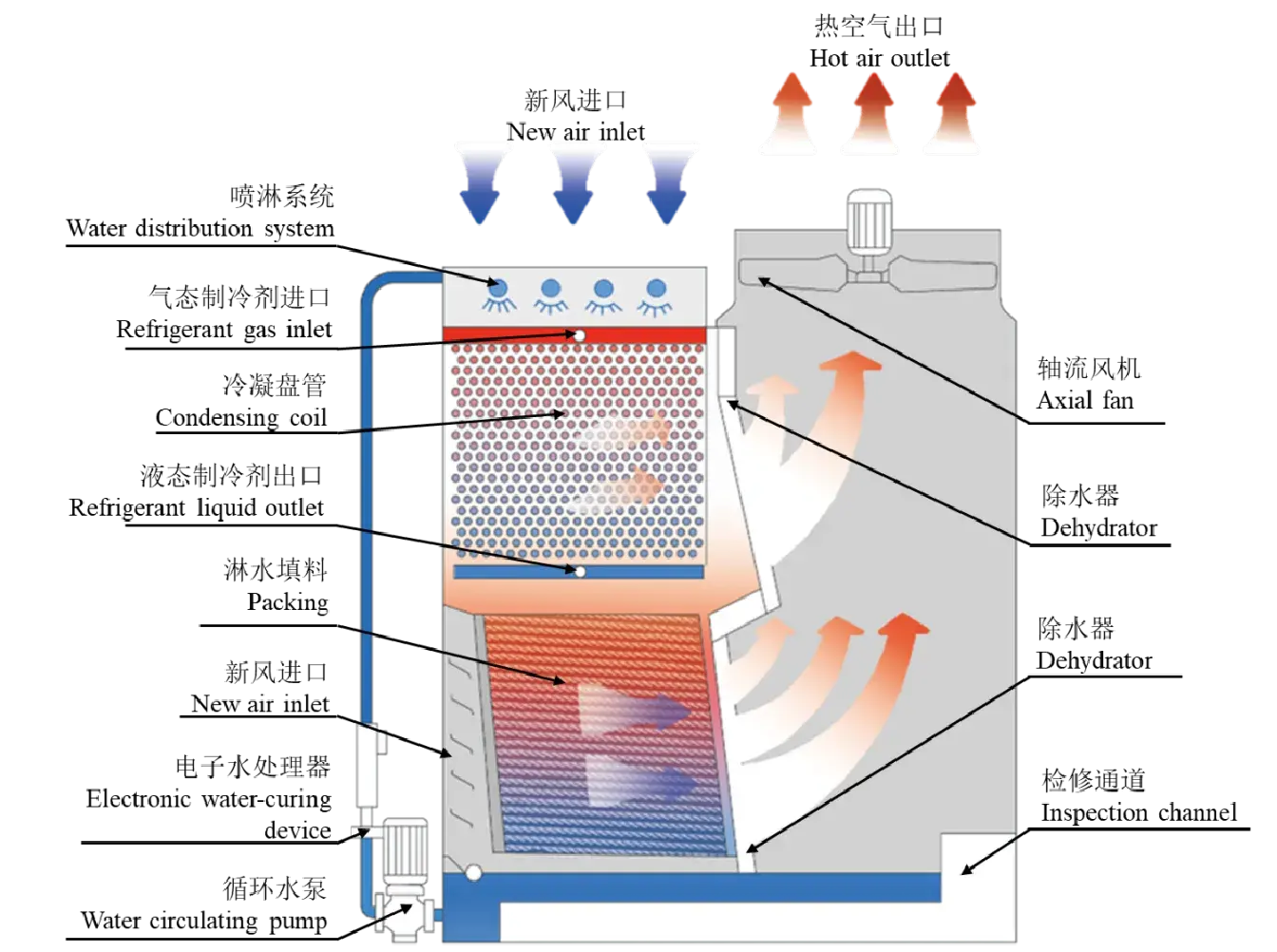 During this process, the high-temperature refrigerant undergoes heat exchange with the water and air surrounding the coil, with the airflow significantly enhancing the heat transfer efficiency. The cooling water and air absorb heat, causing their temperatures to rise sharply. Part of the cooling water vaporises into water vapour, and this evaporation carries away substantial heat, which is drawn out by the fan and discharged into the atmosphere. simultaneously, moisture within the hot air is captured by the demister and directed into the sump. Unvaporised high-temperature cooling water flows into the packing heat exchange layer, where it is cooled by the passing air. After thorough cooling, the water returns to the sump to be recirculated by the pump back into the water distribution system for continued operation. Water lost to the atmosphere is replenished in a timely manner, controlled by the float valve in the sump.